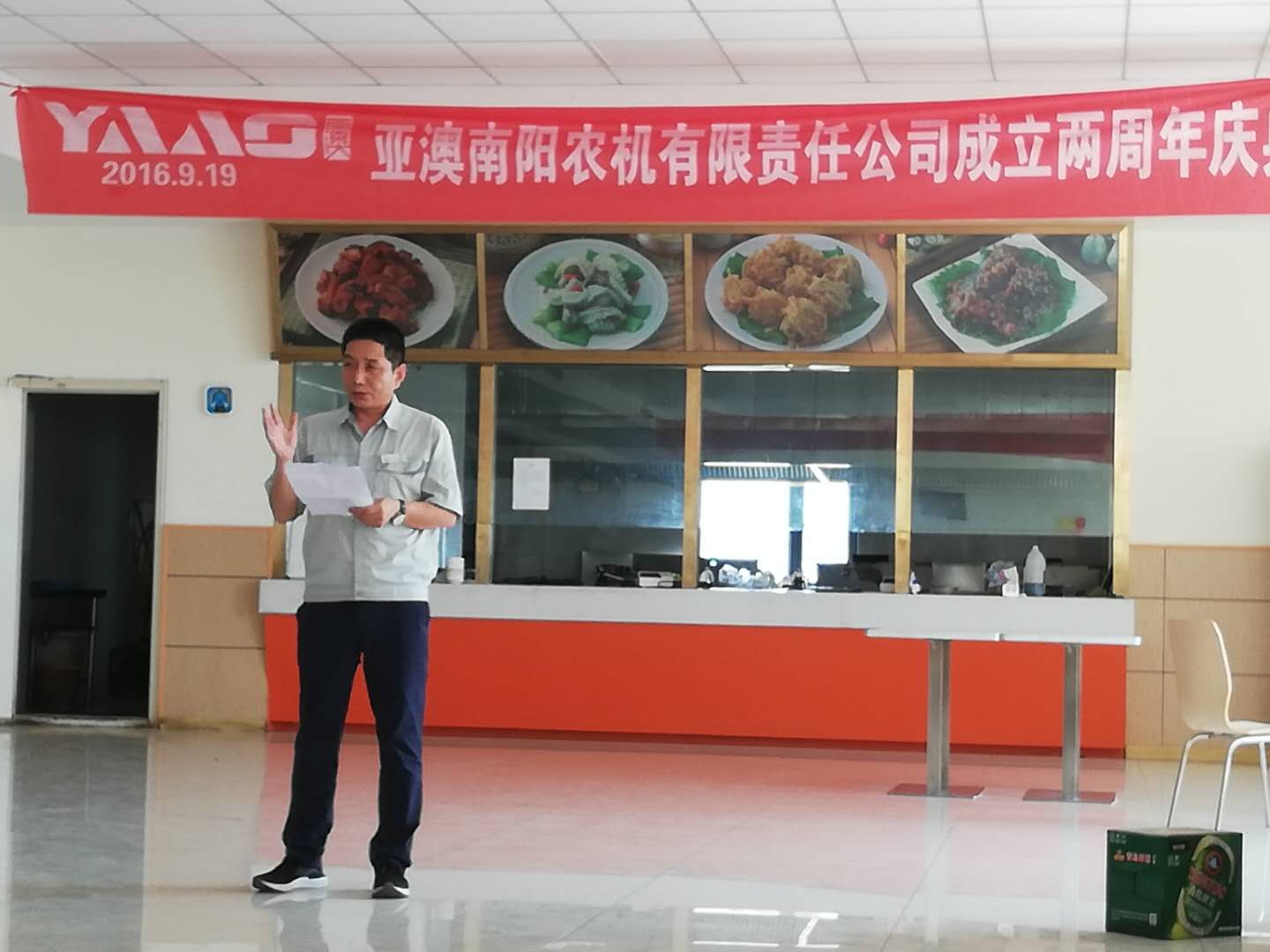 中秋佳節(jié)至,周年慶歡喜。2018年9月23日,亞澳南陽農(nóng)機(jī)有限責(zé)任公司開業(yè)兩周年慶典暨歡度中秋佳節(jié)活動在公司餐廳隆重舉行,因當(dāng)天有生產(chǎn)任務(wù),在不耽誤生產(chǎn)及各部門班組的全力配合下,慶典活動在中午12:00順利開始。