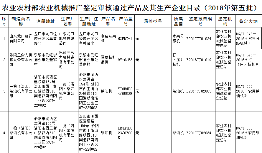 根據(jù)農(nóng)業(yè)部農(nóng)業(yè)機械試驗鑒定總站2018年第五批部級農(nóng)機推廣鑒定結(jié)果的公示,9個型號的機型全部通過農(nóng)機鑒定總站的批準。