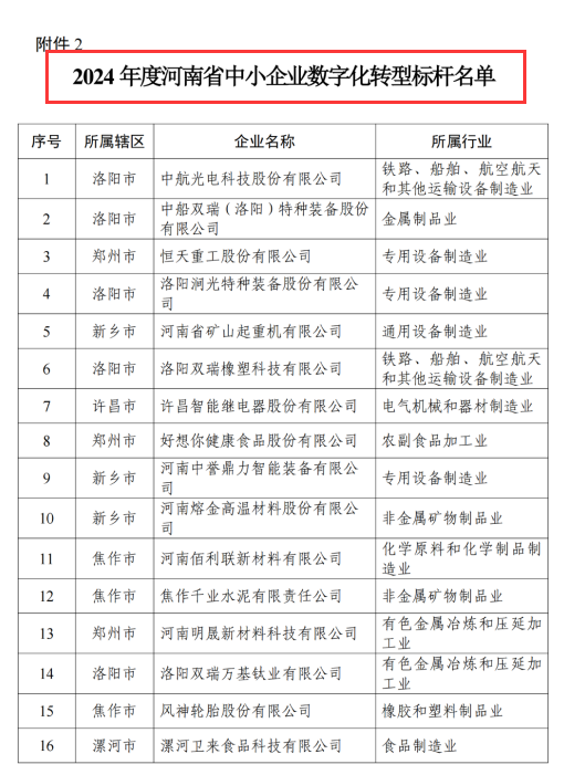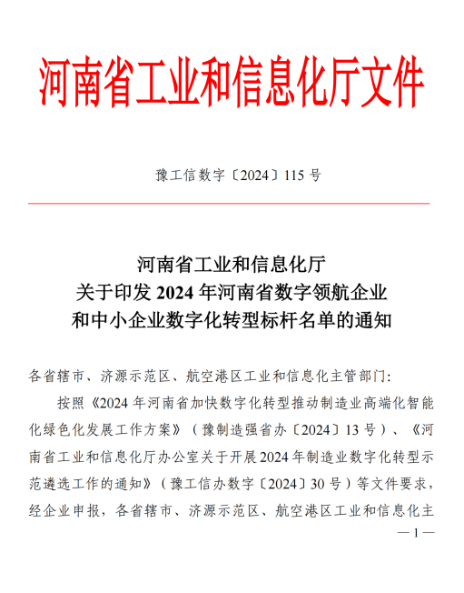 河南省省級中小企業(yè)數(shù)字化轉型標桿企業(yè)