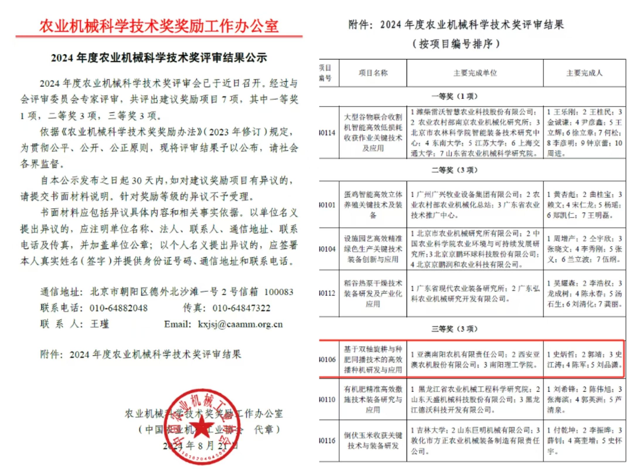 榮耀時(shí)刻:亞澳農(nóng)機(jī)榮獲2024年度農(nóng)業(yè)機(jī)械科學(xué)技術(shù)獎(jiǎng)